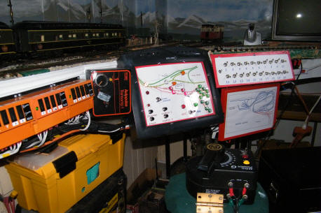 One of four control stations - the layout design is shown here. The switch control boxes shown here are wired to handle the fifteen turnouts in this section. Five more orange switching control boxes are situated at other strategic locations. the switching control boxes handle the double �Y� turnouts approaching the roundhouse buildings. A separate transformer provides the power for train movements into the maintenance depot.